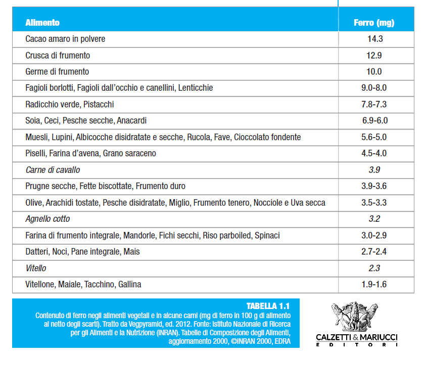 👉Nella tabella 1.1 è indicato il quantitativo di ferro negli alimenti, confrontando quelli vegetali a maggior contenuto di ferro e alcuni alimenti animali tipicamente indicati come ottime fonti di ferro.